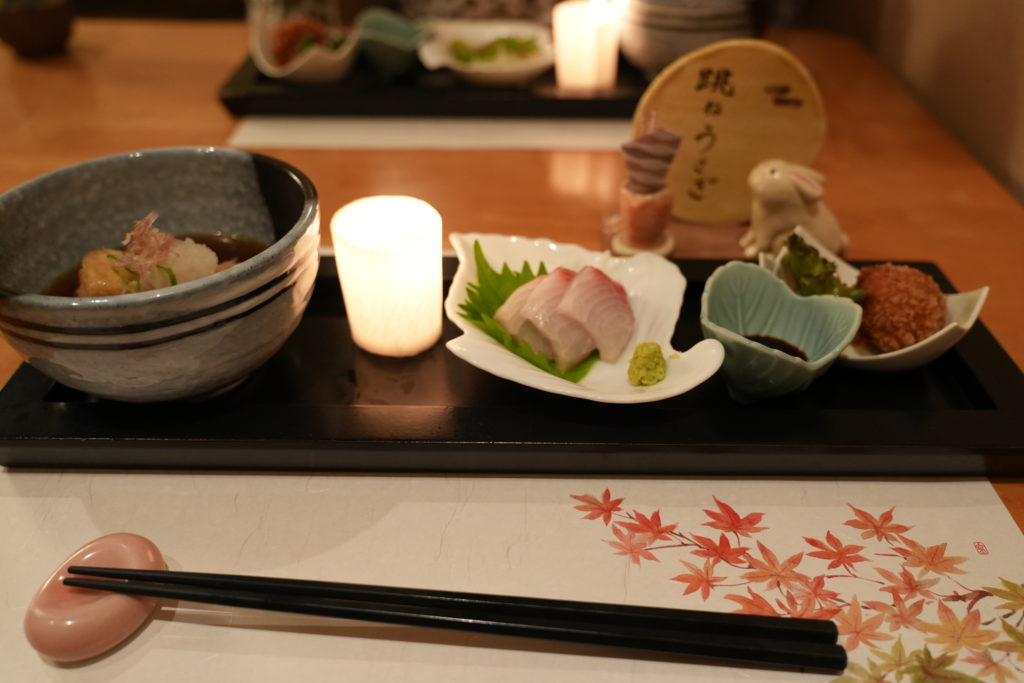 前菜 揚げ出し豆腐、お刺身2種盛り、にんじんと胡桃のサラダ、カボチャクリームコロッケ